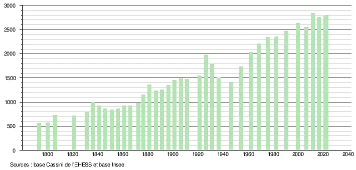 L'évolution du nombre d'habitants est connue à travers les recensements de la population effectués dans la commune depuis 1793. Pour les communes de moins de 10 000 habitants, une enquête de recensement portant sur toute la population est réalisée tous les cinq ans, les populations de référence des années intermédiaires étant quant à elles estimées par interpolation ou extrapolation[32]. Pour la commune, le premier recensement exhaustif entrant dans le cadre du nouveau dispositif a été réalisé en 2006[33].
