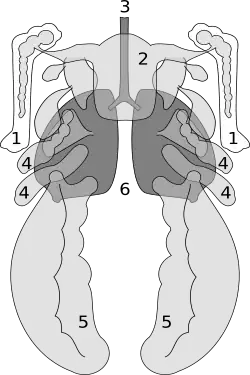 Les poumons des oiseaux sont ventilés par des organes appelés les sacs aériens antérieurs et postérieurs[2],[3]. Les sacs aériens ne jouent pas de rôle dans les échanges gazeux mais contribuent à apporter un volume fixe d’air frais[2]. Grâce aux sacs aériens, l'air traverse les poumons de façon continue indépendamment des mouvements d'inspiration et d'expiration[3]. Grâce à ce systèmes de poches d'air, l'apport d'oxygène dans le sang est continu[3].
