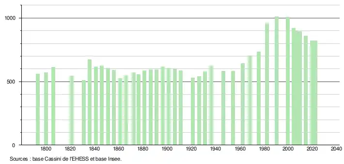 L'évolution du nombre d'habitants est connue à travers les recensements de la population effectués dans la commune depuis 1793. Pour les communes de moins de 10 000 habitants, une enquête de recensement portant sur toute la population est réalisée tous les cinq ans, les populations de référence des années intermédiaires étant quant à elles estimées par interpolation ou extrapolation[12]. Pour la commune, le premier recensement exhaustif entrant dans le cadre du nouveau dispositif a été réalisé en 2004[13].