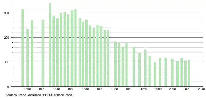 L'évolution du nombre d'habitants est connue à travers les recensements de la population effectués dans la commune depuis 1793. Pour les communes de moins de 10 000 habitants, une enquête de recensement portant sur toute la population est réalisée tous les cinq ans, les populations de référence des années intermédiaires étant quant à elles estimées par interpolation ou extrapolation[50]. Pour la commune, le premier recensement exhaustif entrant dans le cadre du nouveau dispositif a été réalisé en 2007[51].