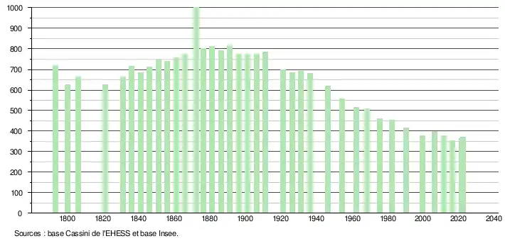 L'évolution du nombre d'habitants est connue à travers les recensements de la population effectués dans la commune depuis 1793. Pour les communes de moins de 10 000 habitants, une enquête de recensement portant sur toute la population est réalisée tous les cinq ans, les populations de référence des années intermédiaires étant quant à elles estimées par interpolation ou extrapolation[23]. Pour la commune, le premier recensement exhaustif entrant dans le cadre du nouveau dispositif a été réalisé en 2006[24].