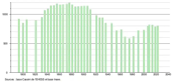 L'évolution du nombre d'habitants est connue à travers les recensements de la population effectués dans la commune depuis 1793. Pour les communes de moins de 10 000 habitants, une enquête de recensement portant sur toute la population est réalisée tous les cinq ans, les populations de référence des années intermédiaires étant quant à elles estimées par interpolation ou extrapolation[18]. Pour la commune, le premier recensement exhaustif entrant dans le cadre du nouveau dispositif a été réalisé en 2008[19].