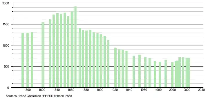 L'évolution du nombre d'habitants est connue à travers les recensements de la population effectués dans la commune depuis 1793. Pour les communes de moins de 10 000 habitants, une enquête de recensement portant sur toute la population est réalisée tous les cinq ans, les populations de référence des années intermédiaires étant quant à elles estimées par interpolation ou extrapolation[18]. Pour la commune, le premier recensement exhaustif entrant dans le cadre du nouveau dispositif a été réalisé en 2004[19].
