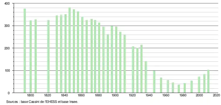 - ↑ Par convention dans Wikipédia, le principe a été retenu de n’afficher dans le tableau des recensements et le graphique, pour les populations légales postérieures à 1999, que les populations correspondant à une enquête exhaustive de recensement pour les communes de moins de 10 000 habitants, et que les populations des années 2006, 2011, 2016, etc. pour les communes de plus de 10 000 habitants, ainsi que la dernière population légale publiée par l’Insee pour l'ensemble des communes.