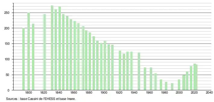 L'évolution du nombre d'habitants est connue à travers les recensements de la population effectués dans la commune depuis 1793. Pour les communes de moins de 10 000 habitants, une enquête de recensement portant sur toute la population est réalisée tous les cinq ans, les populations de référence des années intermédiaires étant quant à elles estimées par interpolation ou extrapolation[17]. Pour la commune, le premier recensement exhaustif entrant dans le cadre du nouveau dispositif a été réalisé en 2005[18].