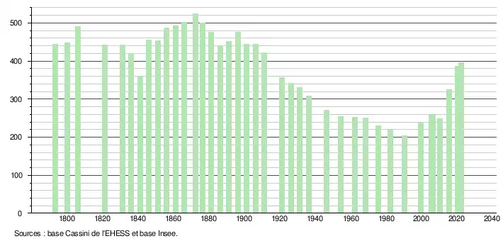 L'évolution du nombre d'habitants est connue à travers les recensements de la population effectués dans la commune depuis 1793. Pour les communes de moins de 10 000 habitants, une enquête de recensement portant sur toute la population est réalisée tous les cinq ans, les populations de référence des années intermédiaires étant quant à elles estimées par interpolation ou extrapolation[28]. Pour la commune, le premier recensement exhaustif entrant dans le cadre du nouveau dispositif a été réalisé en 2005[29].