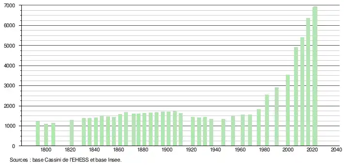 L'évolution du nombre d'habitants est connue à travers les recensements de la population effectués dans la commune depuis 1793. Pour les communes de moins de 10 000 habitants, une enquête de recensement portant sur toute la population est réalisée tous les cinq ans, les populations de référence des années intermédiaires étant quant à elles estimées par interpolation ou extrapolation[31]. Pour la commune, le premier recensement exhaustif entrant dans le cadre du nouveau dispositif a été réalisé en 2006[32].