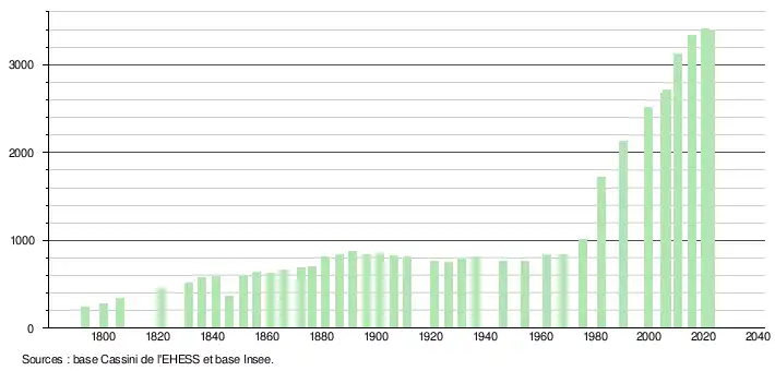 L'évolution du nombre d'habitants est connue à travers les recensements de la population effectués dans la commune depuis 1793. Pour les communes de moins de 10 000 habitants, une enquête de recensement portant sur toute la population est réalisée tous les cinq ans, les populations de référence des années intermédiaires étant quant à elles estimées par interpolation ou extrapolation[35]. Pour la commune, le premier recensement exhaustif entrant dans le cadre du nouveau dispositif a été réalisé en 2005[36].
