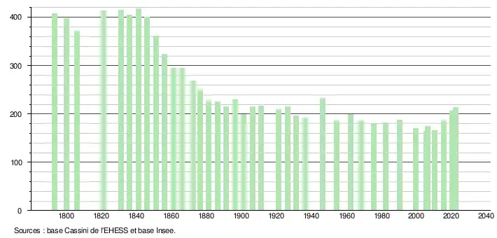 L'évolution du nombre d'habitants est connue à travers les recensements de la population effectués dans la commune depuis 1793. Pour les communes de moins de 10 000 habitants, une enquête de recensement portant sur toute la population est réalisée tous les cinq ans, les populations de référence des années intermédiaires étant quant à elles estimées par interpolation ou extrapolation[26]. Pour la commune, le premier recensement exhaustif entrant dans le cadre du nouveau dispositif a été réalisé en 2005[27].