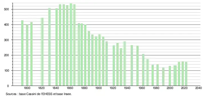 L'évolution du nombre d'habitants est connue à travers les recensements de la population effectués dans la commune depuis 1793. Pour les communes de moins de 10 000 habitants, une enquête de recensement portant sur toute la population est réalisée tous les cinq ans, les populations de référence des années intermédiaires étant quant à elles estimées par interpolation ou extrapolation[21]. Pour la commune, le premier recensement exhaustif entrant dans le cadre du nouveau dispositif a été réalisé en 2007[22].