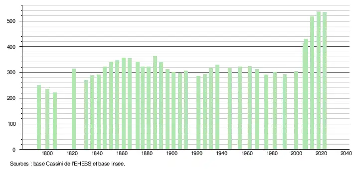 L'évolution du nombre d'habitants est connue à travers les recensements de la population effectués dans la commune depuis 1793. Pour les communes de moins de 10 000 habitants, une enquête de recensement portant sur toute la population est réalisée tous les cinq ans, les populations de référence des années intermédiaires étant quant à elles estimées par interpolation ou extrapolation[15]. Pour la commune, le premier recensement exhaustif entrant dans le cadre du nouveau dispositif a été réalisé en 2007[16].