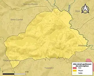 La commune est vulnérable au risque de mouvements de terrains constitué principalement du retrait-gonflement des sols argileux[17]. Cet aléa est susceptible d'engendrer des dommages importants aux bâtiments en cas d’alternance de périodes de sécheresse et de pluie. La totalité de la commune est en aléa moyen ou fort (26,8 % au niveau départemental et 48,5 % au niveau national). Sur les 426 bâtiments dénombrés sur la commune en 2019, 426 sont en aléa moyen ou fort, soit 100 %, à comparer aux 36 % au niveau départemental et 54 % au niveau national. Une cartographie de l'exposition du territoire national au retrait gonflement des sols argileux est disponible sur le site du BRGM[18],[Carte 2].
