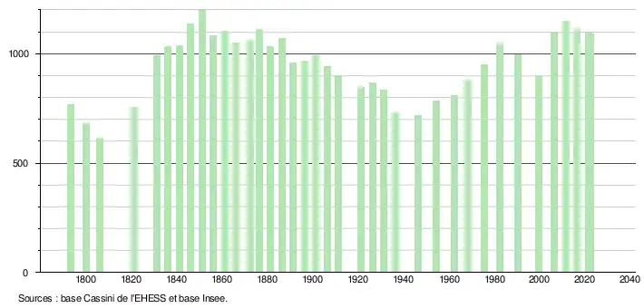 L'évolution du nombre d'habitants est connue à travers les recensements de la population effectués dans la commune depuis 1793. Pour les communes de moins de 10 000 habitants, une enquête de recensement portant sur toute la population est réalisée tous les cinq ans, les populations de référence des années intermédiaires étant quant à elles estimées par interpolation ou extrapolation[25]. Pour la commune, le premier recensement exhaustif entrant dans le cadre du nouveau dispositif a été réalisé en 2006[26].