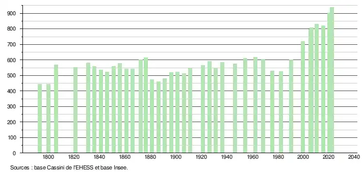 L'évolution du nombre d'habitants est connue à travers les recensements de la population effectués dans la commune depuis 1793. Pour les communes de moins de 10 000 habitants, une enquête de recensement portant sur toute la population est réalisée tous les cinq ans, les populations de référence des années intermédiaires étant quant à elles estimées par interpolation ou extrapolation[17]. Pour la commune, le premier recensement exhaustif entrant dans le cadre du nouveau dispositif a été réalisé en 2005[18].
