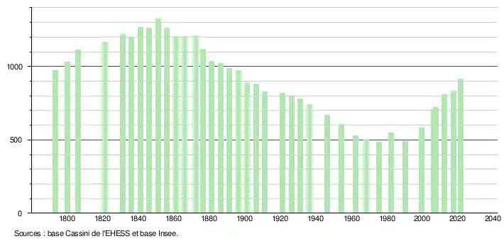 L'évolution du nombre d'habitants est connue à travers les recensements de la population effectués dans la commune depuis 1793. Pour les communes de moins de 10 000 habitants, une enquête de recensement portant sur toute la population est réalisée tous les cinq ans, les populations de référence des années intermédiaires étant quant à elles estimées par interpolation ou extrapolation[3]. Pour la commune, le premier recensement exhaustif entrant dans le cadre du nouveau dispositif a été réalisé en 2007[4].
