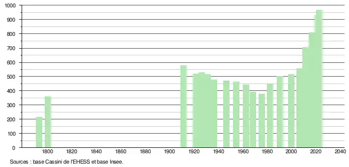 L'évolution du nombre d'habitants est connue à travers les recensements de la population effectués dans la commune depuis 1793. Pour les communes de moins de 10 000 habitants, une enquête de recensement portant sur toute la population est réalisée tous les cinq ans, les populations de référence des années intermédiaires étant quant à elles estimées par interpolation ou extrapolation[23]. Pour la commune, le premier recensement exhaustif entrant dans le cadre du nouveau dispositif a été réalisé en 2006[24].