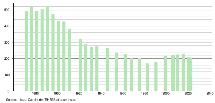L'évolution du nombre d'habitants est connue à travers les recensements de la population effectués dans la commune depuis 1872. Pour les communes de moins de 10 000 habitants, une enquête de recensement portant sur toute la population est réalisée tous les cinq ans, les populations de référence des années intermédiaires étant quant à elles estimées par interpolation ou extrapolation[21]. Pour la commune, le premier recensement exhaustif entrant dans le cadre du nouveau dispositif a été réalisé en 2005[22].