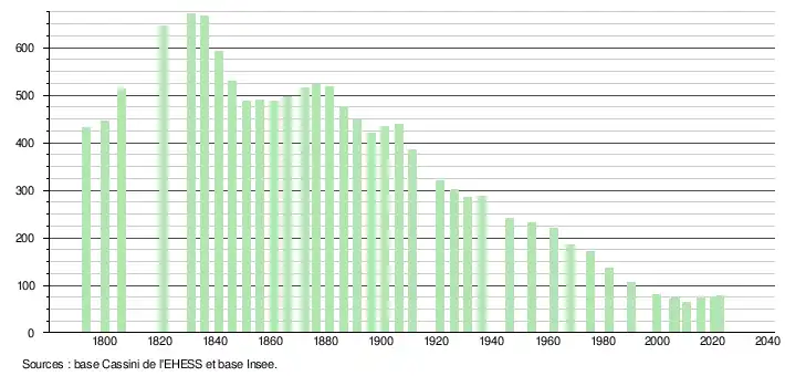 L'évolution du nombre d'habitants est connue à travers les recensements de la population effectués dans la commune depuis 1793. Pour les communes de moins de 10 000 habitants, une enquête de recensement portant sur toute la population est réalisée tous les cinq ans, les populations de référence des années intermédiaires étant quant à elles estimées par interpolation ou extrapolation[16]. Pour la commune, le premier recensement exhaustif entrant dans le cadre du nouveau dispositif a été réalisé en 2005[17].