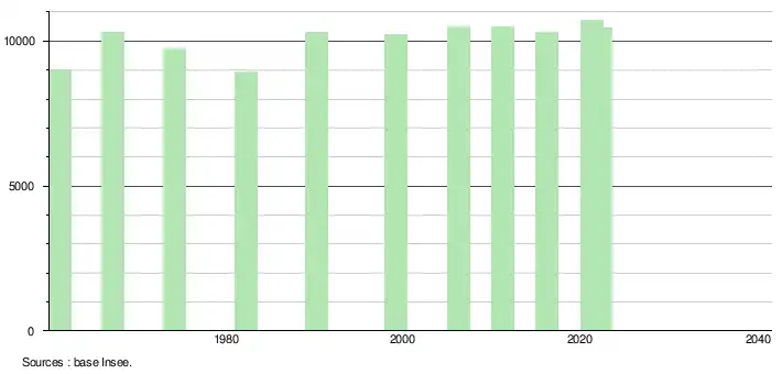 - ↑ Par convention dans Wikipédia, le principe a été retenu de n’afficher dans le tableau des recensements et le graphique, pour les populations de référence postérieures à 1999, que les populations correspondant à une enquête exhaustive de recensement pour les communes de moins de 10 000 habitants, et que les populations des années 2006, 2011, 2016, etc. pour les communes de plus de 10 000 habitants, ainsi que la dernière population de référence publiée par l’Insee pour l'ensemble des communes.