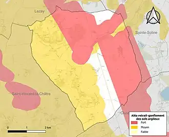 Les mouvements de terrains susceptibles de se produire sur la commune sont des tassements différentiels[18]. Le retrait-gonflement des sols argileux est susceptible d'engendrer des dommages importants aux bâtiments en cas d’alternance de périodes de sécheresse et de pluie[19]. 87,4 % de la superficie communale est en aléa moyen ou fort (54,9 % au niveau départemental et 48,5 % au niveau national)[Carte 2]. Depuis le , en application de la loi ELAN, différentes contraintes s'imposent aux vendeurs, maîtres d'ouvrages ou constructeurs de biens situés dans une zone classée en aléa moyen ou fort[Note 1],[20].