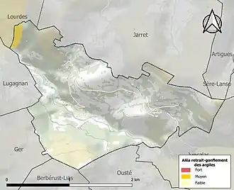 La commune est vulnérable au risque de mouvements de terrains constitué principalement du retrait-gonflement des sols argileux[23]. Cet aléa est susceptible d'engendrer des dommages importants aux bâtiments en cas d’alternance de périodes de sécheresse et de pluie. 1,2 % de la superficie communale est en aléa moyen ou fort (44,5 % au niveau départemental et 48,5 % au niveau national). Sur les 50 bâtiments dénombrés sur la commune en 2019, 0 sont en aléa moyen ou fort, soit 0 %, à comparer aux 75 % au niveau départemental et 54 % au niveau national. Une cartographie de l'exposition du territoire national au retrait gonflement des sols argileux est disponible sur le site du BRGM[24],[Carte 3].