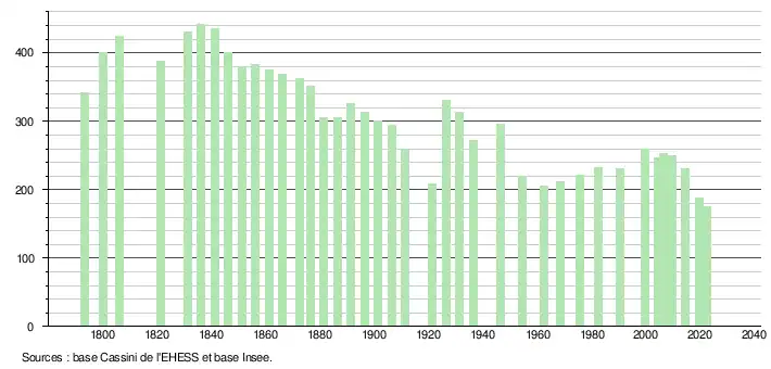 L'évolution du nombre d'habitants est connue à travers les recensements de la population effectués dans la commune depuis 1793. Pour les communes de moins de 10 000 habitants, une enquête de recensement portant sur toute la population est réalisée tous les cinq ans, les populations de référence des années intermédiaires étant quant à elles estimées par interpolation ou extrapolation[22]. Pour la commune, le premier recensement exhaustif entrant dans le cadre du nouveau dispositif a été réalisé en 2004[23].