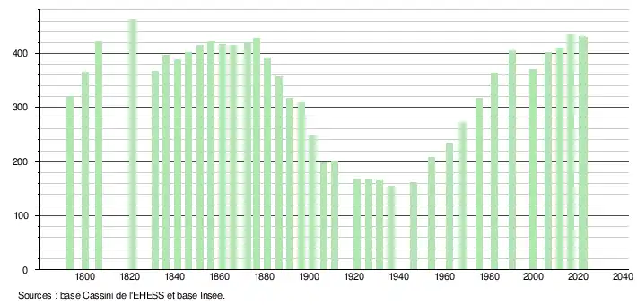 L'évolution du nombre d'habitants est connue à travers les recensements de la population effectués dans la commune depuis 1793. Pour les communes de moins de 10 000 habitants, une enquête de recensement portant sur toute la population est réalisée tous les cinq ans, les populations de référence des années intermédiaires étant quant à elles estimées par interpolation ou extrapolation[20]. Pour la commune, le premier recensement exhaustif entrant dans le cadre du nouveau dispositif a été réalisé en 2006[21].