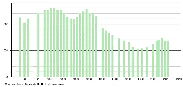L'évolution du nombre d'habitants est connue à travers les recensements de la population effectués dans la commune depuis 1793. Pour les communes de moins de 10 000 habitants, une enquête de recensement portant sur toute la population est réalisée tous les cinq ans, les populations de référence des années intermédiaires étant quant à elles estimées par interpolation ou extrapolation[19]. Pour la commune, le premier recensement exhaustif entrant dans le cadre du nouveau dispositif a été réalisé en 2008[20].