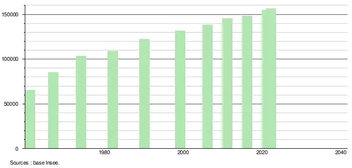 - ↑ Par convention dans Wikipédia, le principe a été retenu de n’afficher dans le tableau des recensements et le graphique, pour les populations de référence postérieures à 1999, que les populations correspondant à une enquête exhaustive de recensement pour les communes de moins de 10 000 habitants, et que les populations des années 2006, 2011, 2016, etc. pour les communes de plus de 10 000 habitants, ainsi que la dernière population de référence publiée par l’Insee pour l'ensemble des communes.