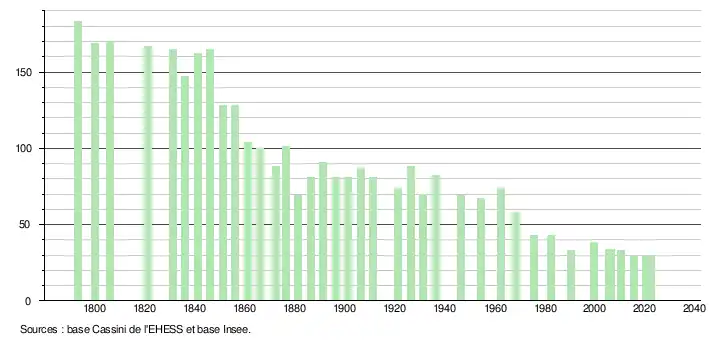 L'évolution du nombre d'habitants est connue à travers les recensements de la population effectués dans la commune depuis 1793. Pour les communes de moins de 10 000 habitants, une enquête de recensement portant sur toute la population est réalisée tous les cinq ans, les populations de référence des années intermédiaires étant quant à elles estimées par interpolation ou extrapolation[13]. Pour la commune, le premier recensement exhaustif entrant dans le cadre du nouveau dispositif a été réalisé en 2005[14].