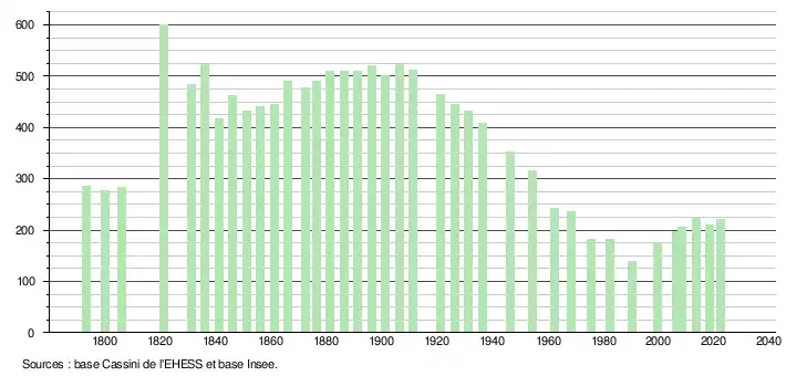 L'évolution du nombre d'habitants est connue à travers les recensements de la population effectués dans la commune depuis 1793. Pour les communes de moins de 10 000 habitants, une enquête de recensement portant sur toute la population est réalisée tous les cinq ans, les populations de référence des années intermédiaires étant quant à elles estimées par interpolation ou extrapolation[32]. Pour la commune, le premier recensement exhaustif entrant dans le cadre du nouveau dispositif a été réalisé en 2008[33].