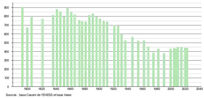 L'évolution du nombre d'habitants est connue à travers les recensements de la population effectués dans la commune depuis 1793. Pour les communes de moins de 10 000 habitants, une enquête de recensement portant sur toute la population est réalisée tous les cinq ans, les populations de référence des années intermédiaires étant quant à elles estimées par interpolation ou extrapolation[40]. Pour la commune, le premier recensement exhaustif entrant dans le cadre du nouveau dispositif a été réalisé en 2004[41].