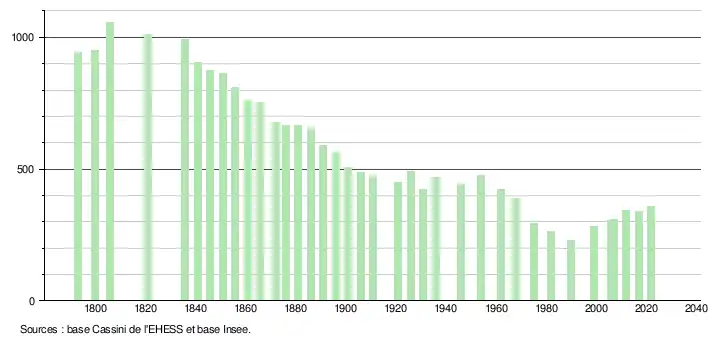 L'évolution du nombre d'habitants est connue à travers les recensements de la population effectués dans la commune depuis 1793. Pour les communes de moins de 10 000 habitants, une enquête de recensement portant sur toute la population est réalisée tous les cinq ans, les populations de référence des années intermédiaires étant quant à elles estimées par interpolation ou extrapolation[32]. Pour la commune, le premier recensement exhaustif entrant dans le cadre du nouveau dispositif a été réalisé en 2007[33].
