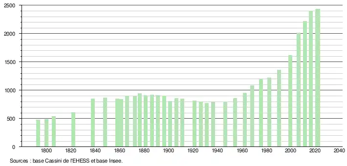 L'évolution du nombre d'habitants est connue à travers les recensements de la population effectués dans la commune depuis 1793. Pour les communes de moins de 10 000 habitants, une enquête de recensement portant sur toute la population est réalisée tous les cinq ans, les populations de référence des années intermédiaires étant quant à elles estimées par interpolation ou extrapolation[33]. Pour la commune, le premier recensement exhaustif entrant dans le cadre du nouveau dispositif a été réalisé en 2006[34].