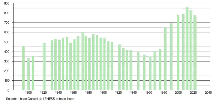. - ↑ Population municipale de référence en vigueur au 1er janvier 2025, millésimée 2022, définie dans les limites territoriales en vigueur au 1er janvier 2024, date de référence statistique : 1er janvier 2022.