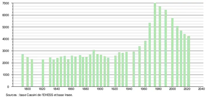 L'évolution du nombre d'habitants est connue à travers les recensements de la population effectués dans la commune depuis 1793. Pour les communes de moins de 10 000 habitants, une enquête de recensement portant sur toute la population est réalisée tous les cinq ans, les populations de référence des années intermédiaires étant quant à elles estimées par interpolation ou extrapolation[21]. Pour la commune, le premier recensement exhaustif entrant dans le cadre du nouveau dispositif a été réalisé en 2006[22].