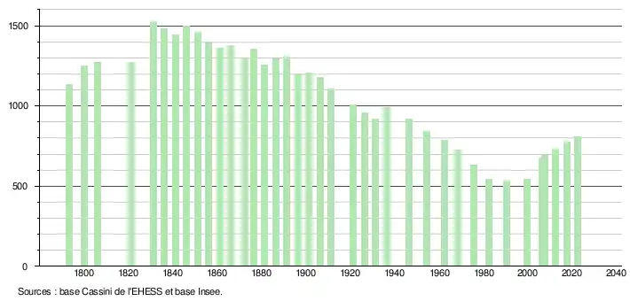 L'évolution du nombre d'habitants est connue à travers les recensements de la population effectués dans la commune depuis 1793. Pour les communes de moins de 10 000 habitants, une enquête de recensement portant sur toute la population est réalisée tous les cinq ans, les populations de référence des années intermédiaires étant quant à elles estimées par interpolation ou extrapolation[16]. Pour la commune, le premier recensement exhaustif entrant dans le cadre du nouveau dispositif a été réalisé en 2007[17].