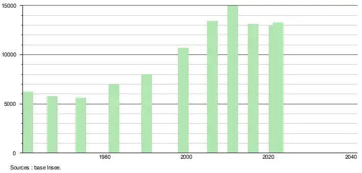- ↑ Par convention dans Wikipédia, le principe a été retenu de n’afficher dans le tableau des recensements et le graphique, pour les populations de référence postérieures à 1999, que les populations correspondant à une enquête exhaustive de recensement pour les communes de moins de 10 000 habitants, et que les populations des années 2006, 2011, 2016, etc. pour les communes de plus de 10 000 habitants, ainsi que la dernière population de référence publiée par l’Insee pour l'ensemble des communes.