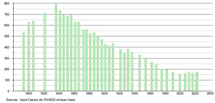 L'évolution du nombre d'habitants est connue à travers les recensements de la population effectués dans la commune depuis 1793. Pour les communes de moins de 10 000 habitants, une enquête de recensement portant sur toute la population est réalisée tous les cinq ans, les populations de référence des années intermédiaires étant quant à elles estimées par interpolation ou extrapolation[29]. Pour la commune, le premier recensement exhaustif entrant dans le cadre du nouveau dispositif a été réalisé en 2006[30].