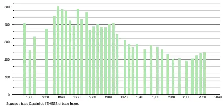 L'évolution du nombre d'habitants est connue à travers les recensements de la population effectués dans la commune depuis 1793. Pour les communes de moins de 10 000 habitants, une enquête de recensement portant sur toute la population est réalisée tous les cinq ans, les populations de référence des années intermédiaires étant quant à elles estimées par interpolation ou extrapolation[53]. Pour la commune, le premier recensement exhaustif entrant dans le cadre du nouveau dispositif a été réalisé en 2007[54].