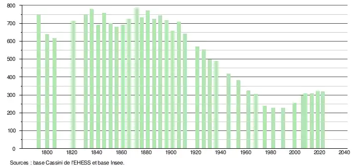 L'évolution du nombre d'habitants est connue à travers les recensements de la population effectués dans la commune depuis 1793. Pour les communes de moins de 10 000 habitants, une enquête de recensement portant sur toute la population est réalisée tous les cinq ans, les populations de référence des années intermédiaires étant quant à elles estimées par interpolation ou extrapolation[27]. Pour la commune, le premier recensement exhaustif entrant dans le cadre du nouveau dispositif a été réalisé en 2008[28].