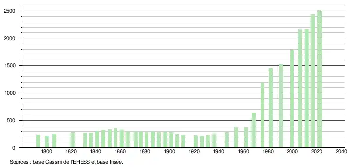 L'évolution du nombre d'habitants est connue à travers les recensements de la population effectués dans la commune depuis 1793. Pour les communes de moins de 10 000 habitants, une enquête de recensement portant sur toute la population est réalisée tous les cinq ans, les populations de référence des années intermédiaires étant quant à elles estimées par interpolation ou extrapolation[29]. Pour la commune, le premier recensement exhaustif entrant dans le cadre du nouveau dispositif a été réalisé en 2006[30].