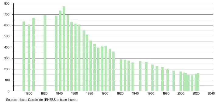 L'évolution du nombre d'habitants est connue à travers les recensements de la population effectués dans la commune depuis 1793. Pour les communes de moins de 10 000 habitants, une enquête de recensement portant sur toute la population est réalisée tous les cinq ans, les populations de référence des années intermédiaires étant quant à elles estimées par interpolation ou extrapolation[27]. Pour la commune, le premier recensement exhaustif entrant dans le cadre du nouveau dispositif a été réalisé en 2004[28].