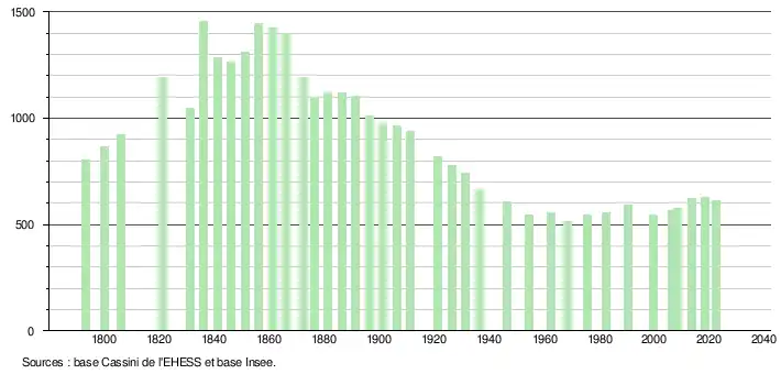 L'évolution du nombre d'habitants est connue à travers les recensements de la population effectués dans la commune depuis 1793. Pour les communes de moins de 10 000 habitants, une enquête de recensement portant sur toute la population est réalisée tous les cinq ans, les populations de référence des années intermédiaires étant quant à elles estimées par interpolation ou extrapolation[20]. Pour la commune, le premier recensement exhaustif entrant dans le cadre du nouveau dispositif a été réalisé en 2008[21].