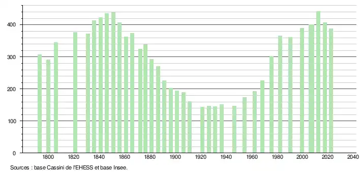 L'évolution du nombre d'habitants est connue à travers les recensements de la population effectués dans la commune depuis 1793. Pour les communes de moins de 10 000 habitants, une enquête de recensement portant sur toute la population est réalisée tous les cinq ans, les populations de référence des années intermédiaires étant quant à elles estimées par interpolation ou extrapolation[15]. Pour la commune, le premier recensement exhaustif entrant dans le cadre du nouveau dispositif a été réalisé en 2007[16].