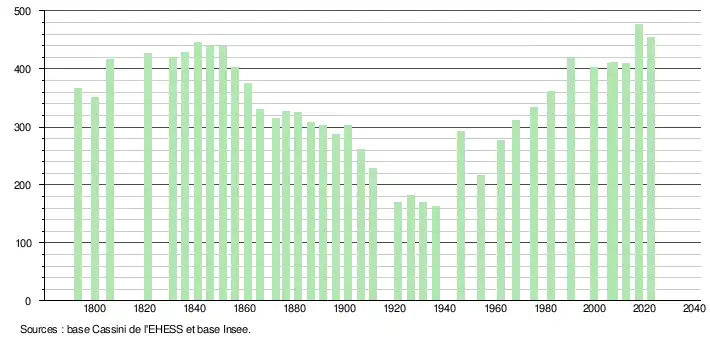 L'évolution du nombre d'habitants est connue à travers les recensements de la population effectués dans la commune depuis 1793. Pour les communes de moins de 10 000 habitants, une enquête de recensement portant sur toute la population est réalisée tous les cinq ans, les populations de référence des années intermédiaires étant quant à elles estimées par interpolation ou extrapolation[26]. Pour la commune, le premier recensement exhaustif entrant dans le cadre du nouveau dispositif a été réalisé en 2007[27].
