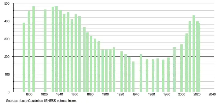 L'évolution du nombre d'habitants est connue à travers les recensements de la population effectués dans la commune depuis 1793. Pour les communes de moins de 10 000 habitants, une enquête de recensement portant sur toute la population est réalisée tous les cinq ans, les populations de référence des années intermédiaires étant quant à elles estimées par interpolation ou extrapolation[20]. Pour la commune, le premier recensement exhaustif entrant dans le cadre du nouveau dispositif a été réalisé en 2005[21].