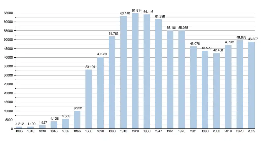 | Habitants | 1 927 | 4 138 | 5 569 | 9 922 | 27 782 | 33 124 | 40 289 | 51 763 | 63 140 | 64 814 | 64 116 | 61 396 | 55 101 | 55 055 | 47 932 | 43 579 | ||||||||||||||