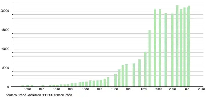- ↑ Par convention dans Wikipédia, le principe a été retenu de n’afficher dans le tableau des recensements et le graphique, pour les populations de référence postérieures à 1999, que les populations correspondant à une enquête exhaustive de recensement pour les communes de moins de 10 000 habitants, et que les populations des années 2006, 2011, 2016, etc. pour les communes de plus de 10 000 habitants, ainsi que la dernière population de référence publiée par l’Insee pour l'ensemble des communes.
