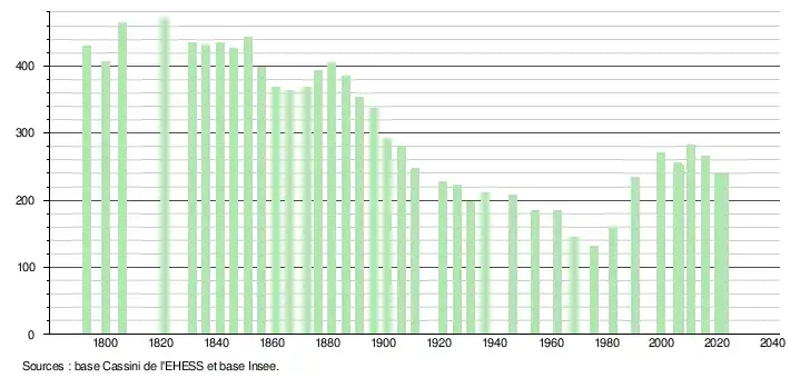 L'évolution du nombre d'habitants est connue à travers les recensements de la population effectués dans la commune depuis 1793. Pour les communes de moins de 10 000 habitants, une enquête de recensement portant sur toute la population est réalisée tous les cinq ans, les populations de référence des années intermédiaires étant quant à elles estimées par interpolation ou extrapolation[17]. Pour la commune, le premier recensement exhaustif entrant dans le cadre du nouveau dispositif a été réalisé en 2005[18].